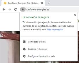 - La página web de Sunflower Energías corre bajo el protocolo https dando un nivel adicional de seguridad en las comunicaciones. Para comprobar que está entrando en este tipo de sitios hay que observar información que ofrecen los navegadores en modo de icono, normalmente un candado en la barra de navegación.